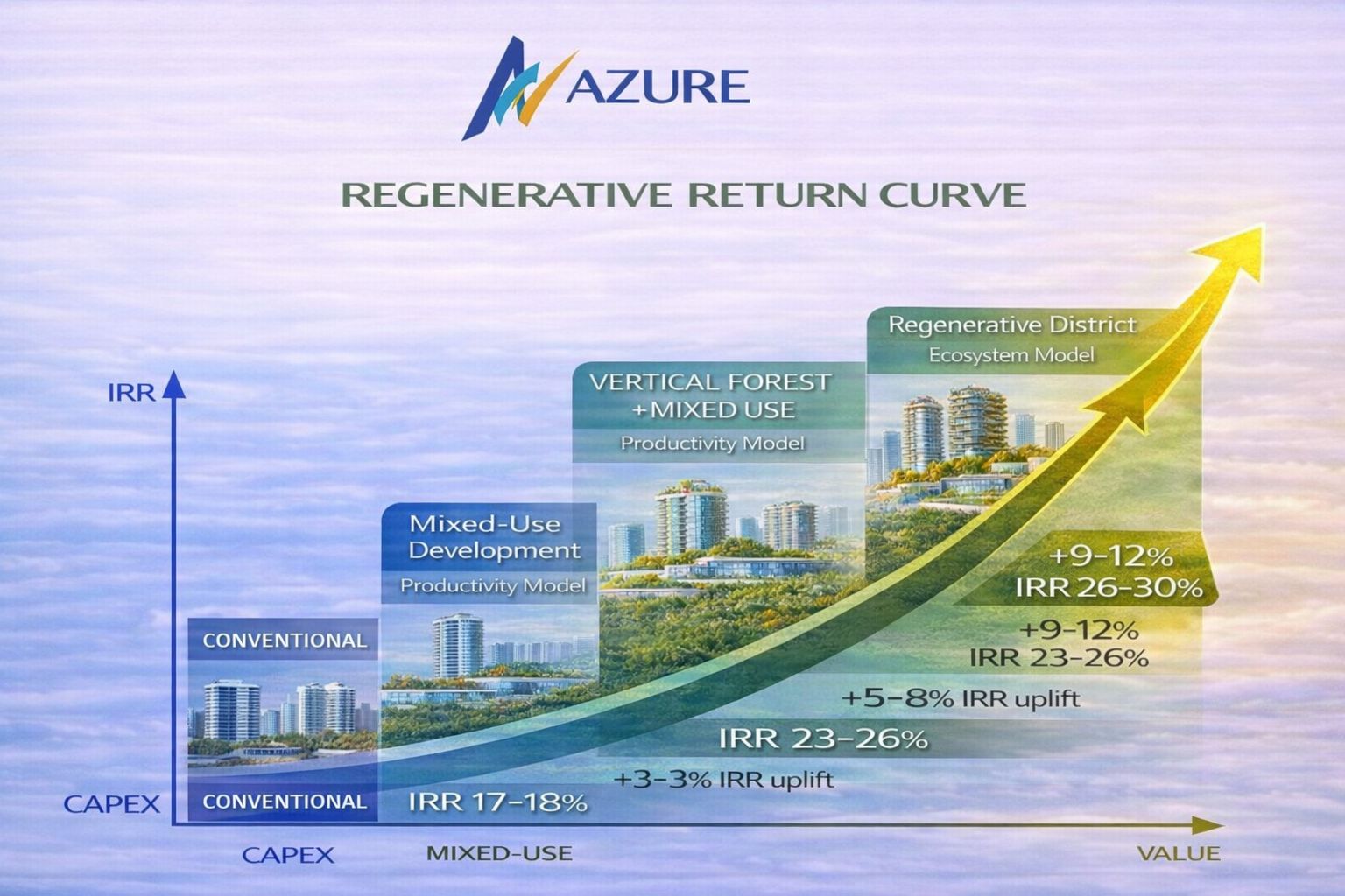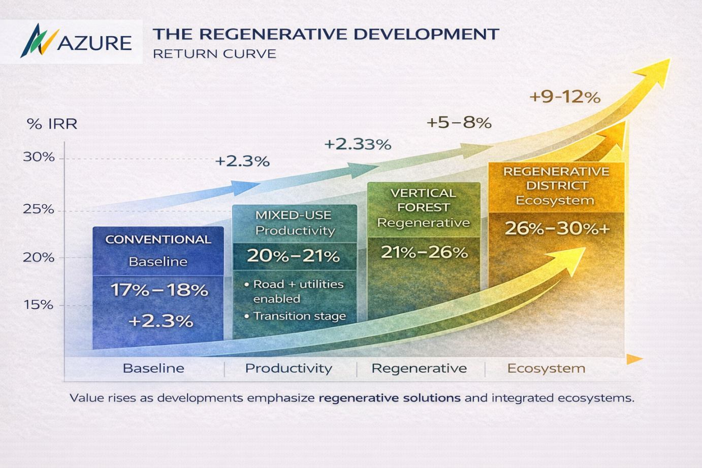 The regenerative development return curve demonstrates how layered design, ecological integration, and mixed-use intensity progressively enhance asset performance—shifting projects from baseline returns to higher IRR outcomes through value creation, capital efficiency, and long-term resilience embedded in in ecosystem-based development models.